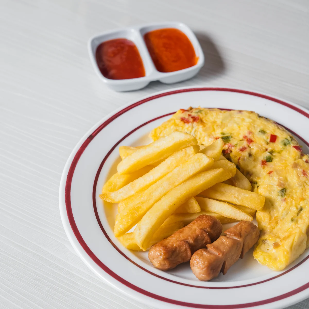 Omelet dengan sayur cincang, bombay dan keju. Disajikan dengan sosis dan kentang